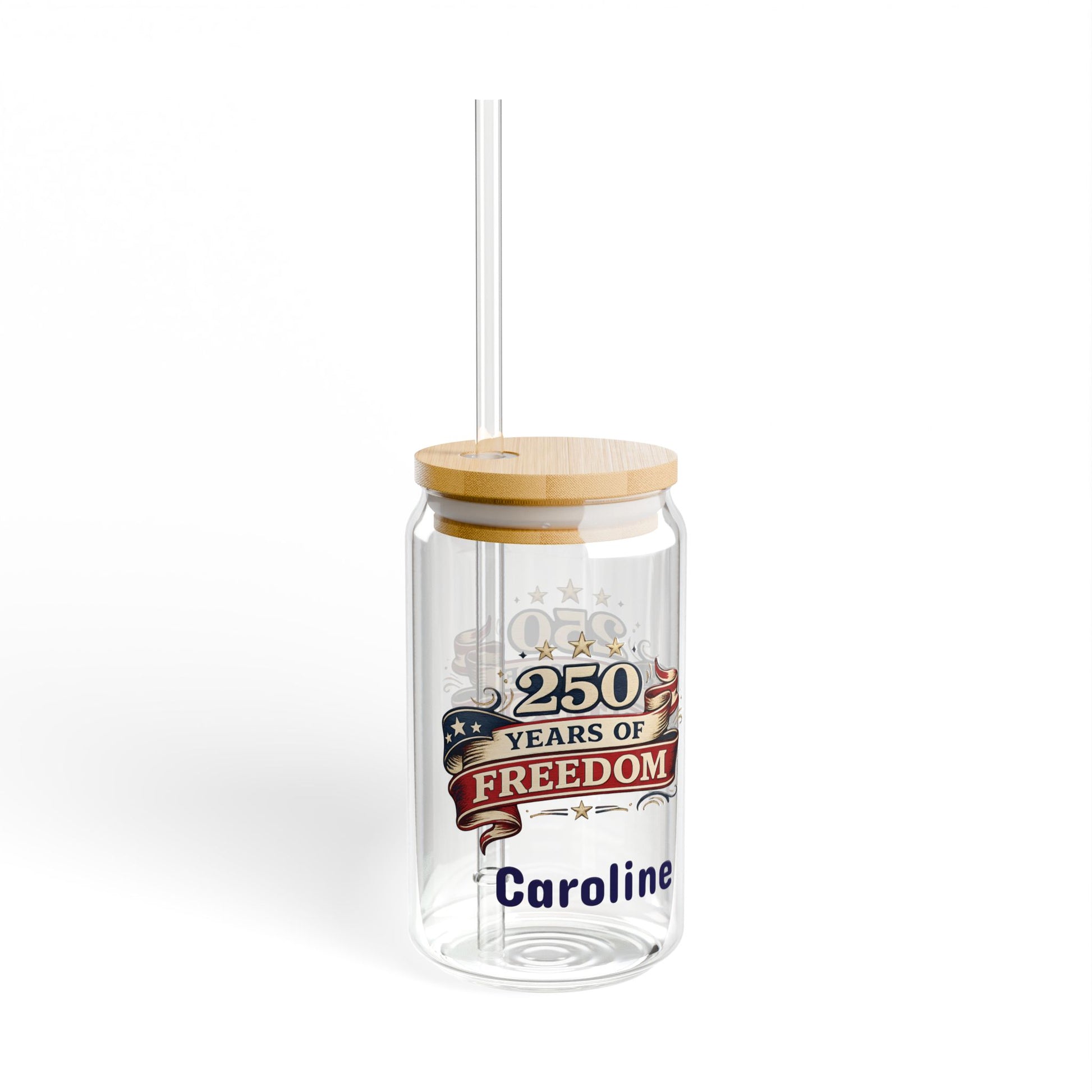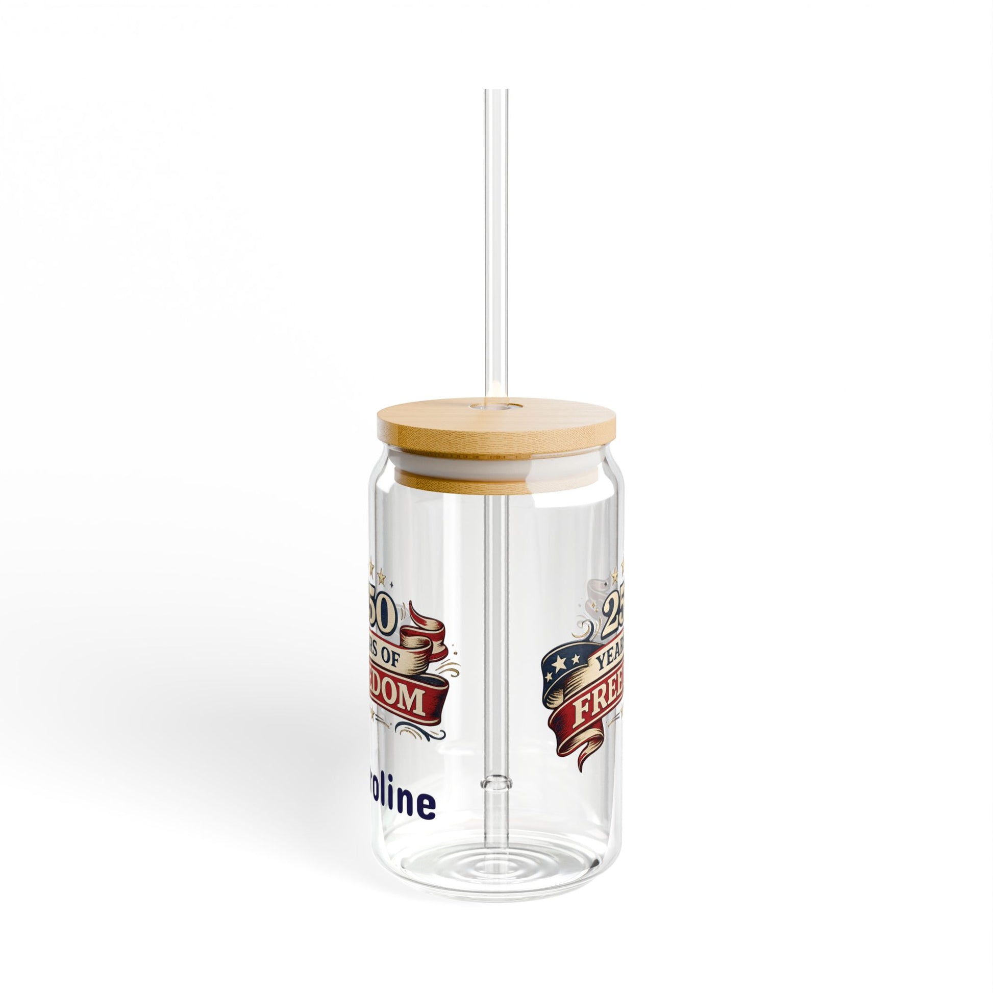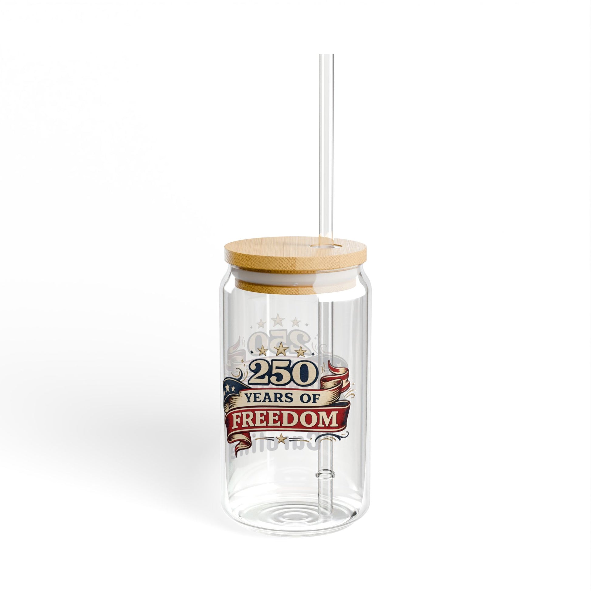Raise a glass to history. This 16oz sipper glass wears a bold, celebratory design commemorating America’s 250th anniversary — bright, crisp colors that stay vivid with the latest printing methods. The clear tempered glass showcases the artwork while keeping your drink front and center. Choose a natural bamboo gasket-push lid and durable Tritan straw to make it an easy carry for backyard barbecues, community parades, or a slow afternoon on the porch. It feels both familiar and special: sturdy, BPA-free, and made in the USA from globally sourced materials. Hand wash gently to keep the print looking its best and enjoy a keepsake that joins in on the celebration whenever you lift it.