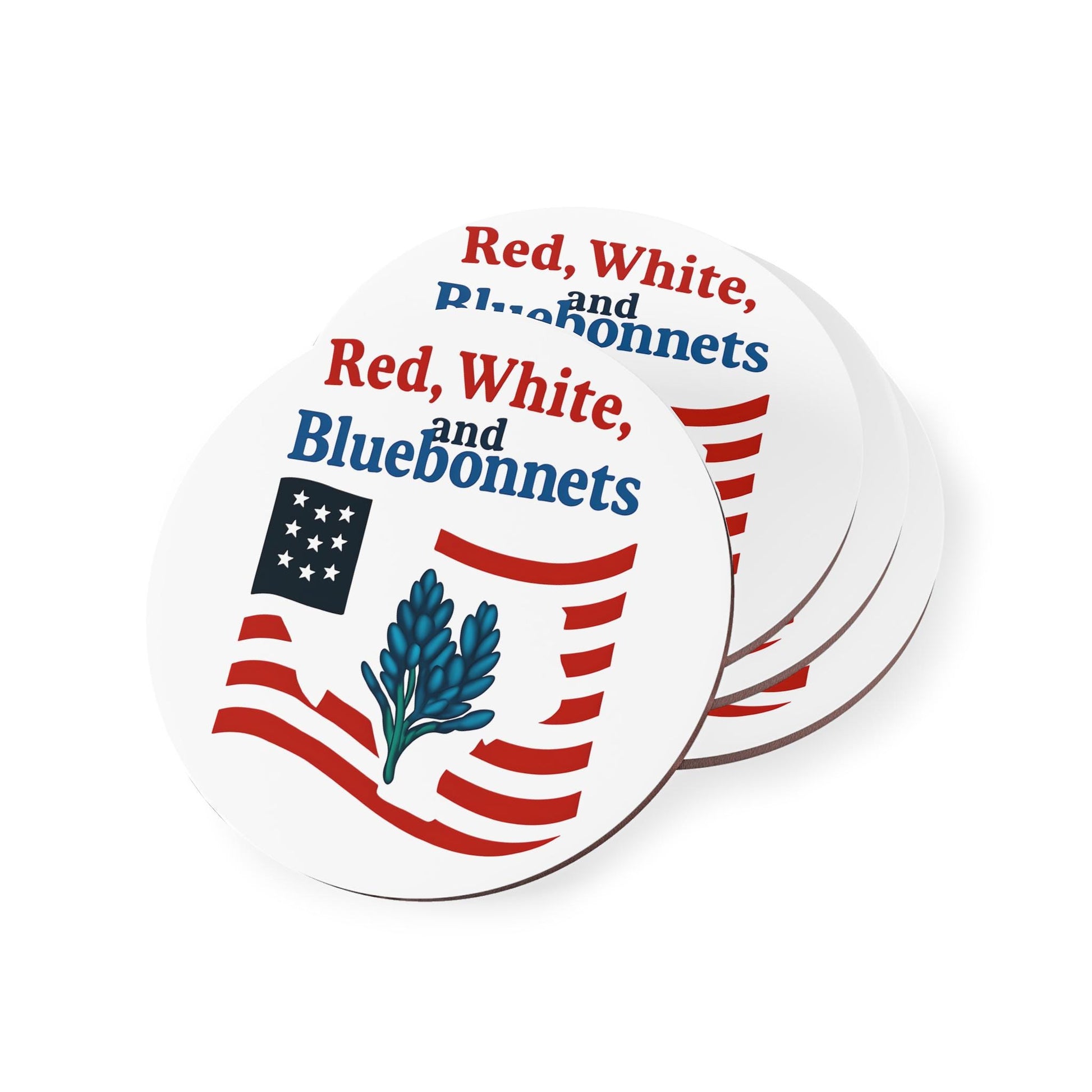 Celebrate Independence Day with these vibrant Red, White, and Bluebonnets Texas themed coasters. Perfect for adding a patriotic touch to your home decor or hosting a Fourth of July party. Ideal for those who love Texas or Americana themes.