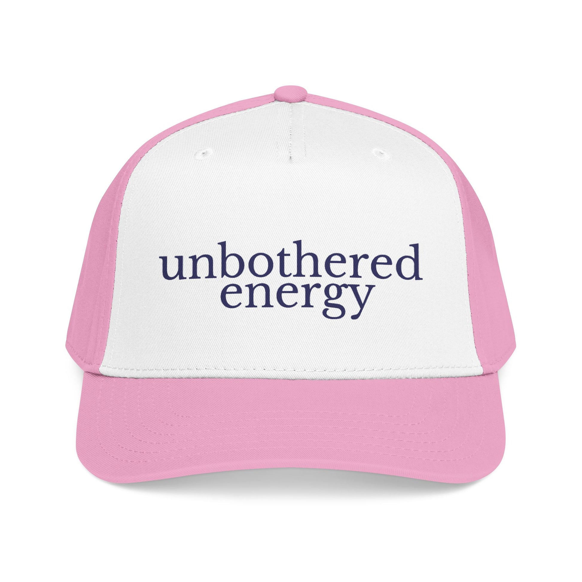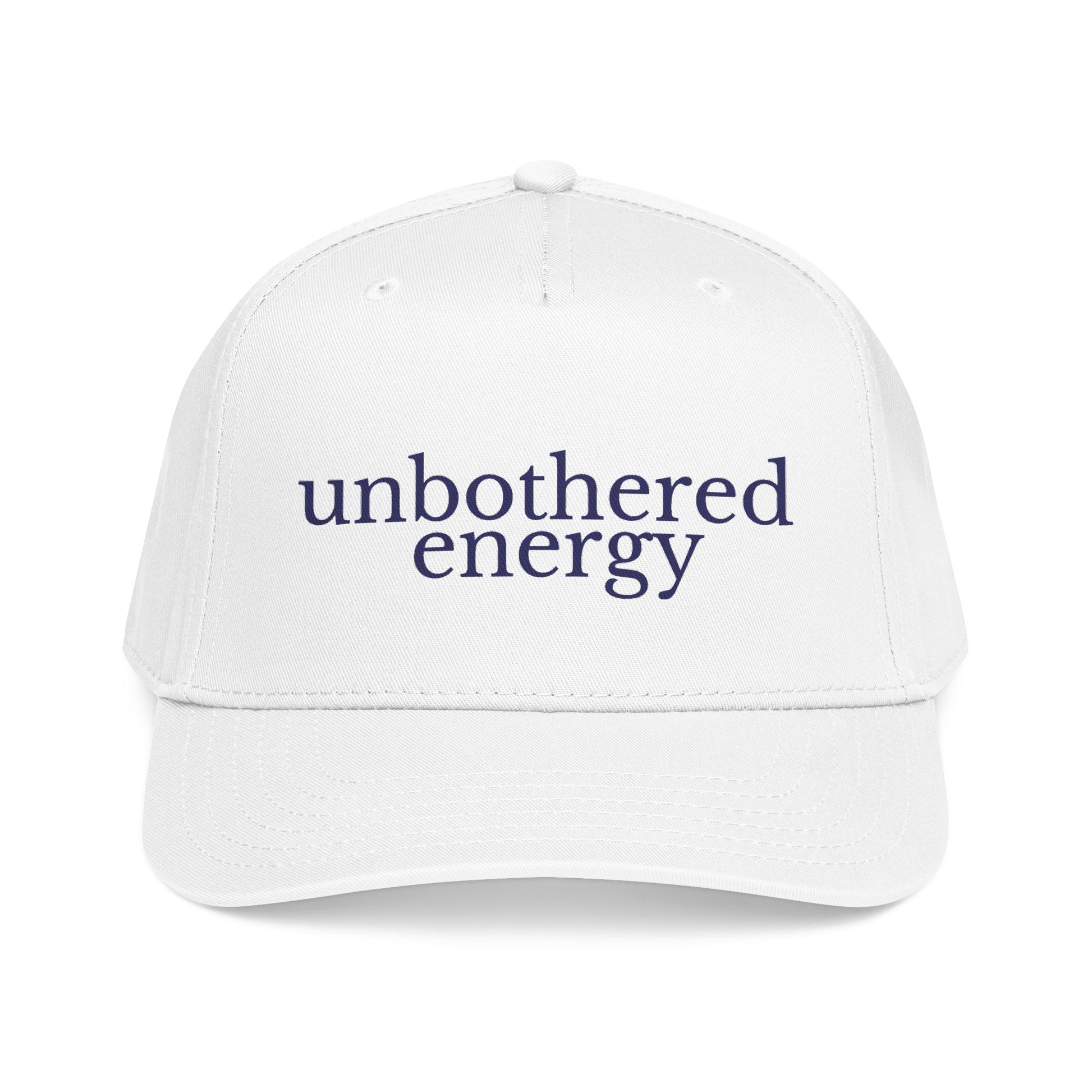 Lightweight, structured, and quietly confident — this mid-profile baseball cap settles into your rotation and stays. Soft sand fabric and a clean, seamless front panel put the navy words “unbothered energy” center stage. It sits low enough to shade your eyes but keeps a polished silhouette thanks to the five-panel construction and subtle matching undervisor. Wear it on slow mornings at the café, while running errands, or layered under a coat for a brisk walk. The tone is calm and intentional — for anyone who wants their look to say ‘I’ve got this’ without shouting. The adjustable snap keeps the fit personal, and the stitched eyelets and matching sweatband help it feel built to last.