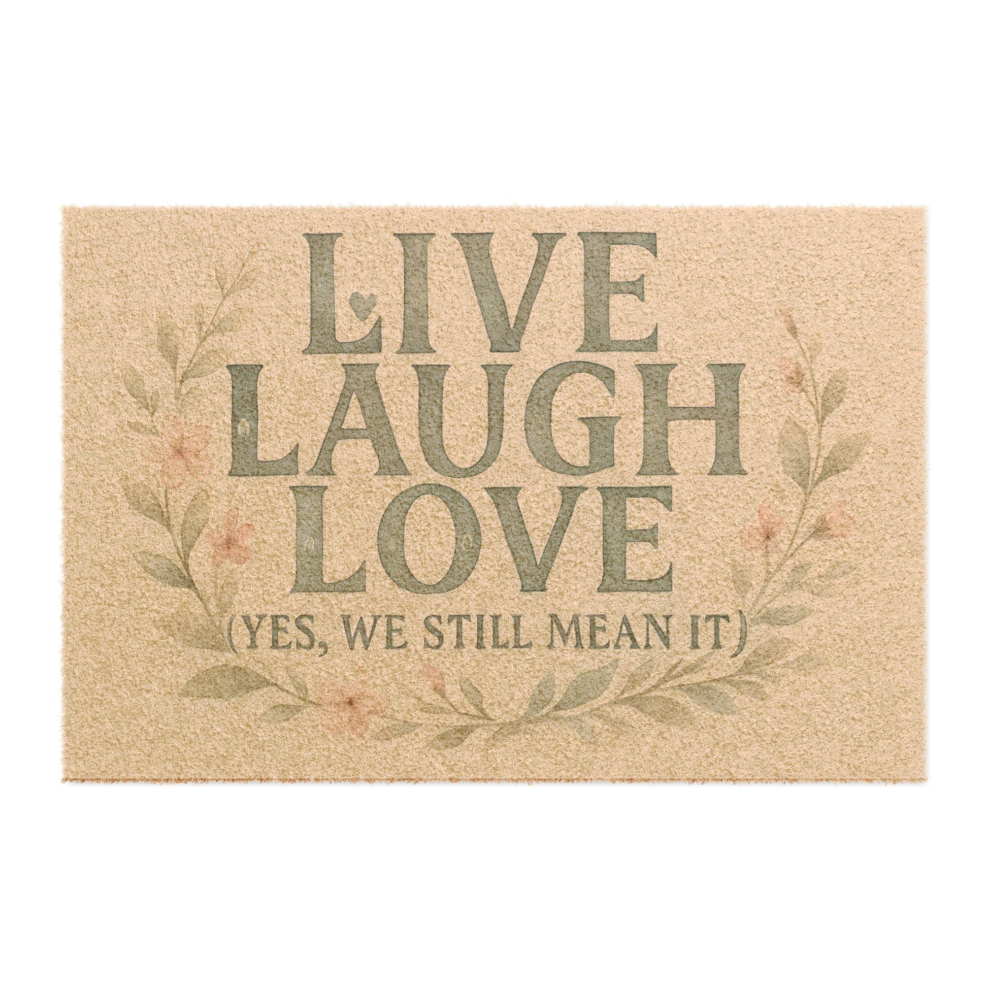 Welcome guests with the Live Laugh Love (Yes, We Still Mean It) doormat. This doormat exudes a warm and inviting atmosphere, perfect for anyone looking to add a touch of positivity to their home. Ideal for those who appreciate a cozy and welcoming entrance. Relevant for everyday use, housewarming gifts, or as a thoughtful present for friends and family.